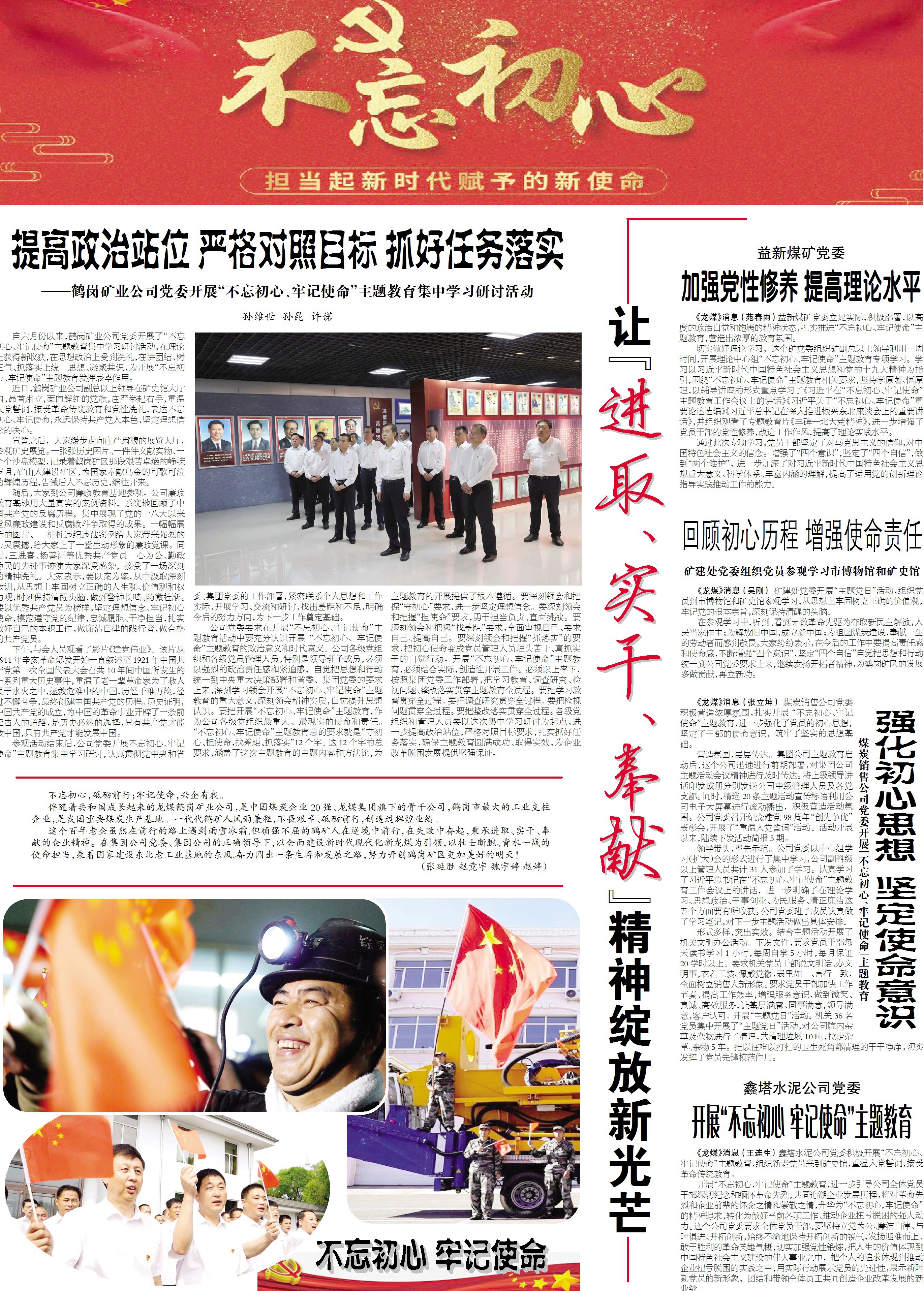 開展“不忘初心,牢記使命”主題教育,進一步引導(dǎo)公司全體黨員干部深切紀念和緬懷革命先烈,共同追溯企業(yè)發(fā)展歷程,將對革命先烈和企業(yè)前輩的懷念之情和崇敬之情,升華為“不忘初心,牢記使命”的精神追求,轉(zhuǎn)化為做好當(dāng)前各項工作、推動企業(yè)扭虧脫困的強大動力。這個公司黨委要求全體黨員干部,要堅持立黨為公、廉潔自律、與時俱進、開拓創(chuàng)新,始終不渝地保持開拓創(chuàng)新的銳氣,發(fā)揚迎難而上、敢于勝利的革命英雄氣概,切實加強黨性鍛煉,把人生的價值體現(xiàn)到中國特色社會主義建設(shè)的偉大事業(yè)之中,把個人的追求體現(xiàn)到推動企業(yè)扭虧脫困的實踐之中,用實際行動展示黨員的先進性,展示新時期黨員的新形象,團結(jié)和帶領(lǐng)全體員工共同創(chuàng)造企業(yè)改革發(fā)展的新業(yè)績。(王連生)