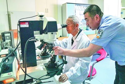 圖為崔道植(左)在進(jìn)行痕跡檢驗(yàn)工作。新華社發(fā)