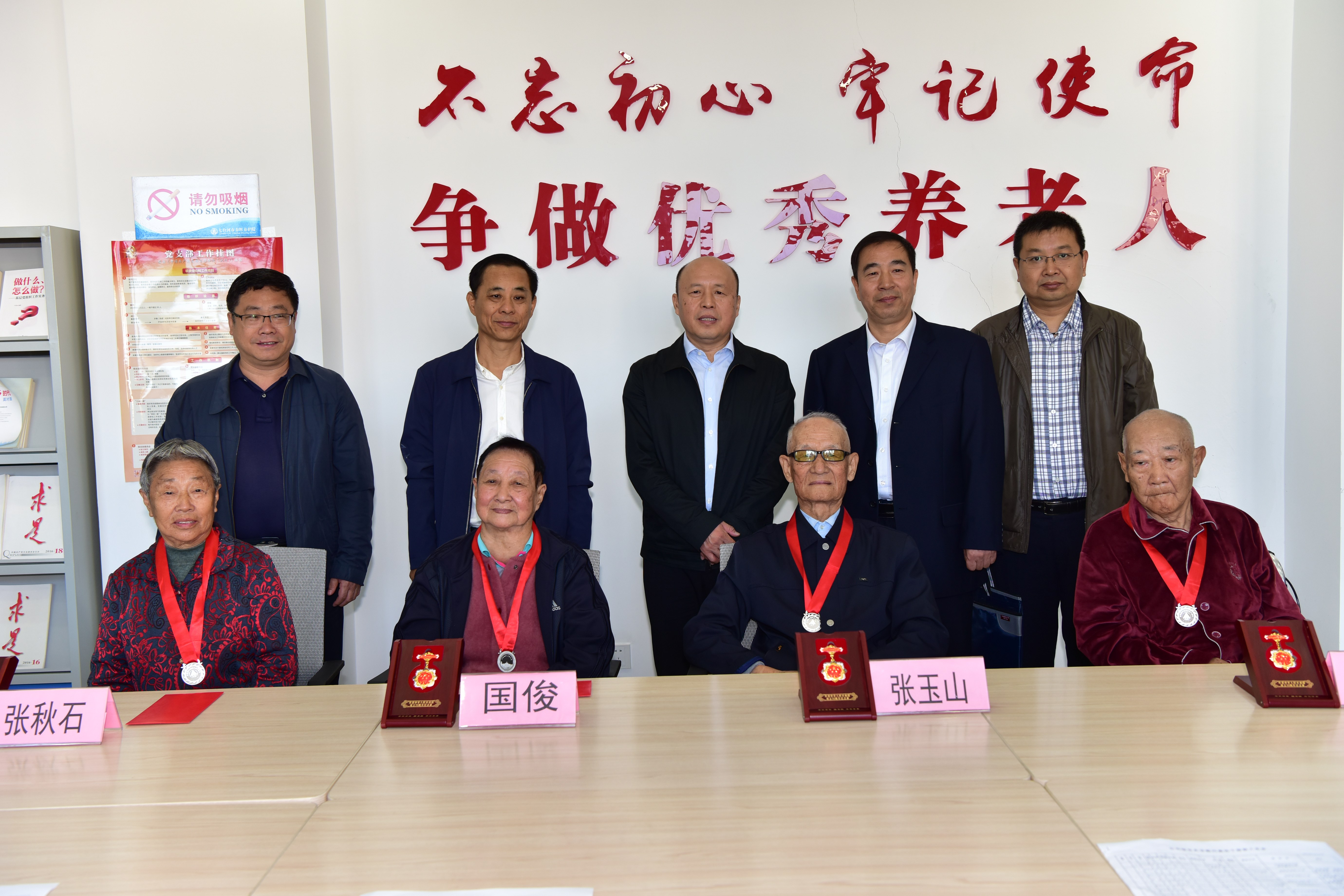 張長(zhǎng)山等領(lǐng)導(dǎo)還深入春暉養(yǎng)老院看望慰問(wèn)了孟憲章、張玉山、國(guó)俊、張秋石,為他們送去了節(jié)日的祝福和組織的關(guān)懷,對(duì)他們?yōu)閲?guó)家建設(shè)和企業(yè)發(fā)展做出的貢獻(xiàn)給予高度評(píng)價(jià),為他們頒發(fā)發(fā)“慶祝中華人民共和國(guó)成立七十周年紀(jì)念章”和七臺(tái)河公司頒發(fā)的礦區(qū)開(kāi)拓者銀質(zhì)獎(jiǎng)?wù)?、礦區(qū)開(kāi)拓者獎(jiǎng)金,叮囑他們要保重身體,祝愿他們晚年幸福美滿(mǎn)。