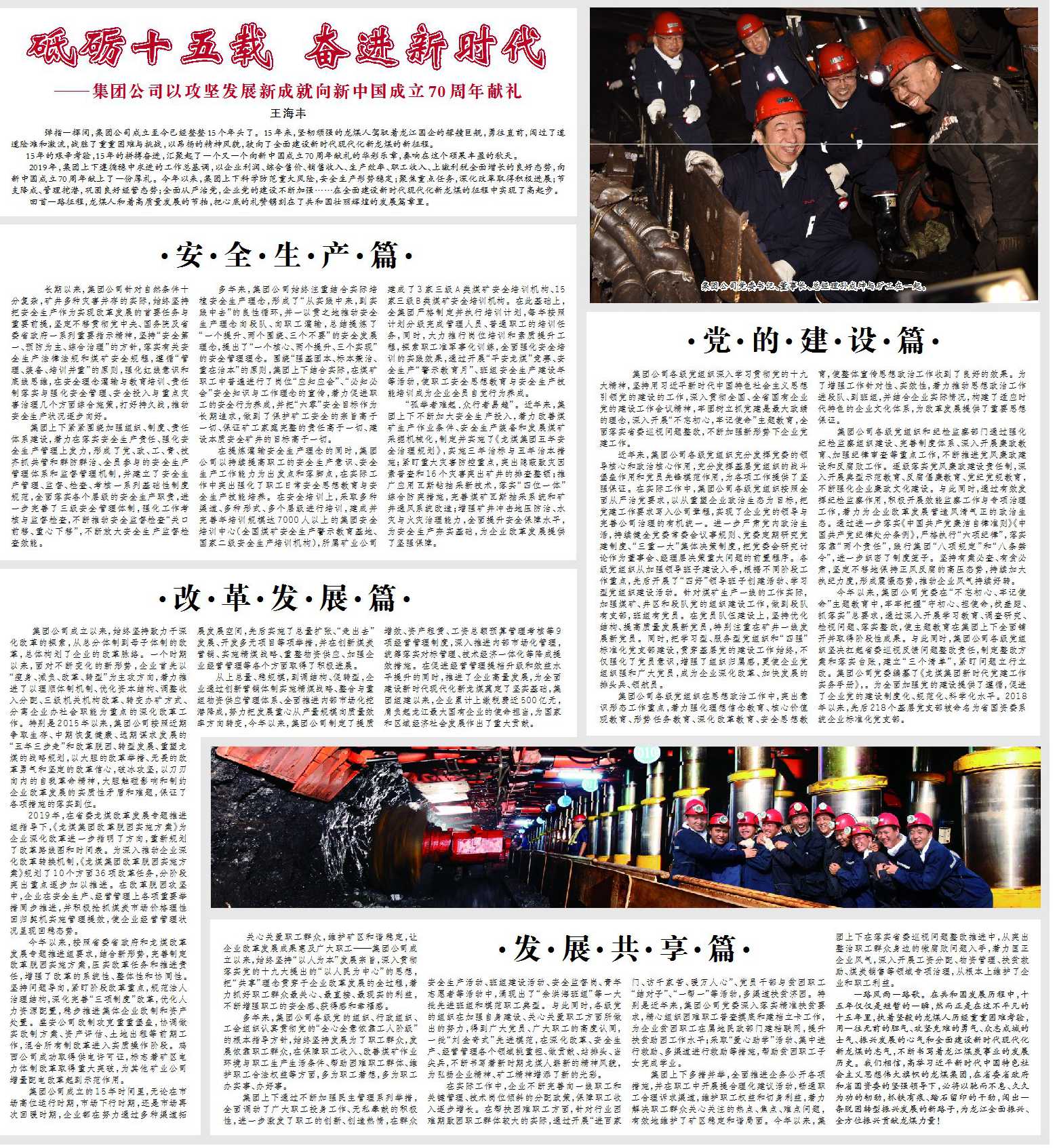 一路風(fēng)雨一路歌。在共和國發(fā)展歷程中,十五年僅僅是短暫的一瞬,然而正是在這不平凡的十五年里,執(zhí)著堅毅的龍煤人歷經(jīng)重重困難考驗,用一往無前的膽氣、攻堅克難的勇氣、眾志成城的士氣、振興發(fā)展的心氣和全面建設(shè)新時代現(xiàn)代化新龍煤的志氣,不斷書寫著龍江煤炭事業(yè)的發(fā)展歷史。我們相信,高舉習(xí)近平新時代中國特色社會主義思想偉大旗幟的龍煤集團(tuán),在省委省政府和省國資委的堅強(qiáng)領(lǐng)導(dǎo)下,必將以馳而不息、久久為功的韌勁,抓鐵有痕、踏石留印的干勁,闖出一條脫困轉(zhuǎn)型振興發(fā)展的新路子,為龍江全面振興、全方位振興貢獻(xiàn)龍煤力量!