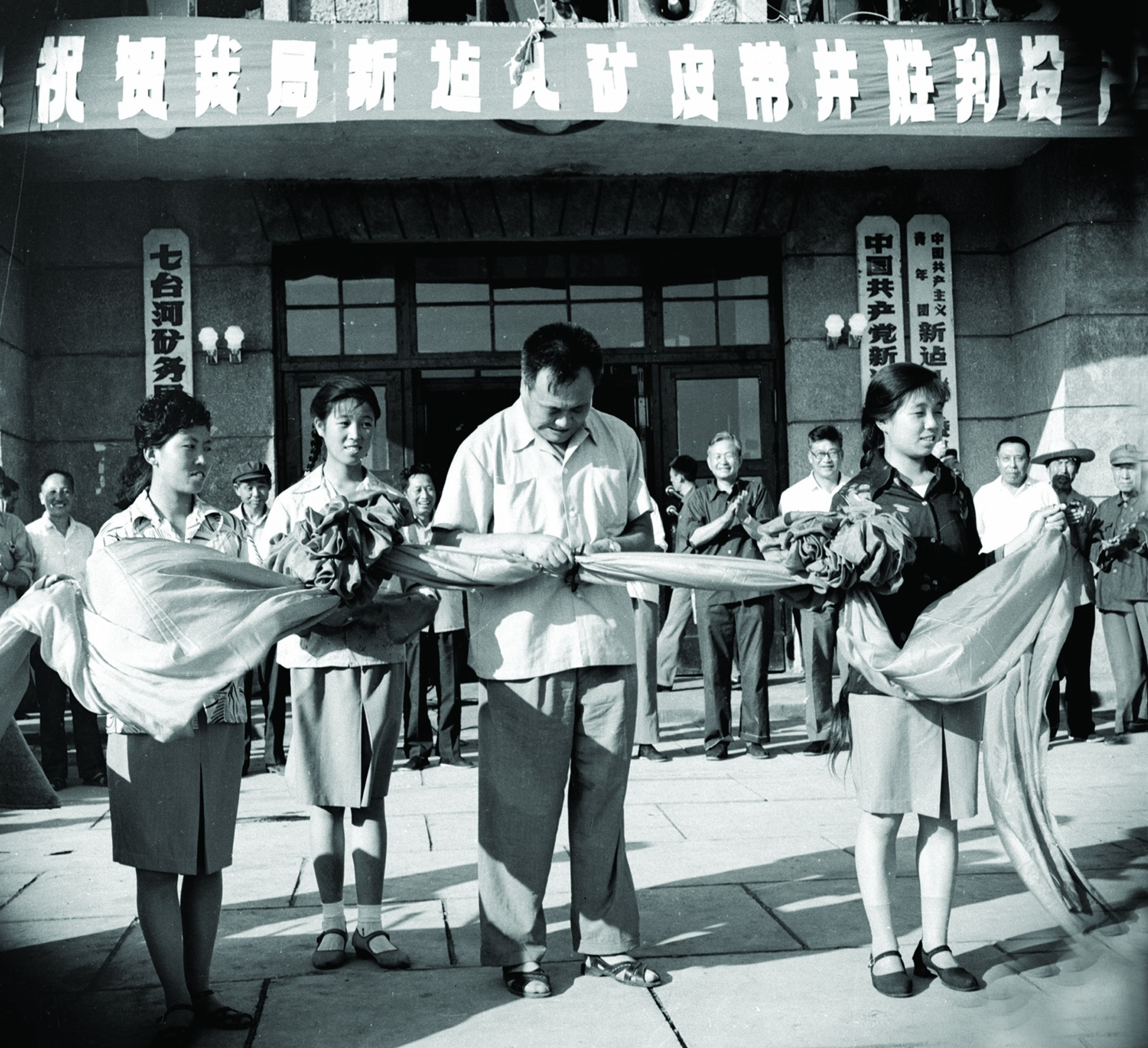 1982年8月1日,七臺(tái)河礦區(qū)新建煤礦皮帶井移交投產(chǎn),圖為七臺(tái)河市委書記張占德為投產(chǎn)剪彩