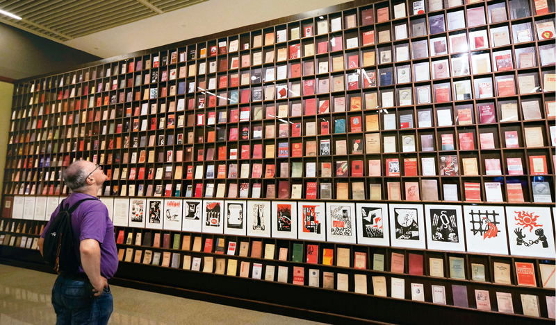 2018年5月9日,一位外國觀眾被北京“真理的力量——紀念馬克思誕辰200周年主題展覽”中一面展示不同國家出版的500多種《共產(chǎn)黨宣言》的書墻所吸引。 中新社記者 賈天勇/攝