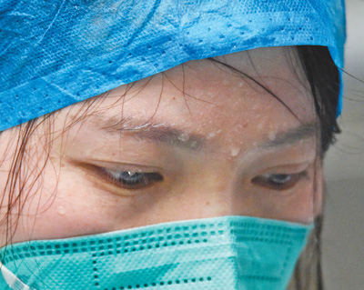 湖南省郴州市嘉禾縣人民醫(yī)院檢驗(yàn)科護(hù)士曾梅連續(xù)工作6個(gè)小時(shí)后卸下護(hù)目鏡。黃春濤攝(影像中國)
