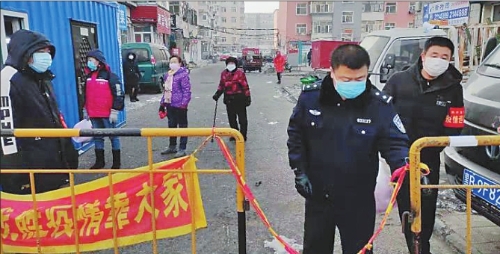 王春天在疫情防控期間,和同事一同進(jìn)行小區(qū)封控任務(wù)。圖片由齊齊哈爾市公安局提供