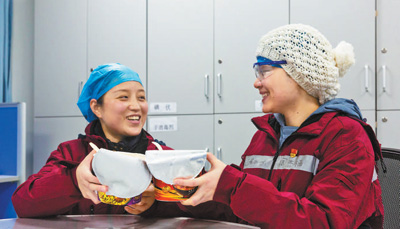 2月9日,中南大學(xué)湘雅二醫(yī)院援鄂醫(yī)療隊(duì)護(hù)士周杰楠(右)在武漢度過(guò)了29歲生日。在緊張的工作間隙,她與同樣是當(dāng)天過(guò)生日的同事曾艷一起吃方便面當(dāng)做慶祝。人民日?qǐng)?bào)記者 張武軍攝