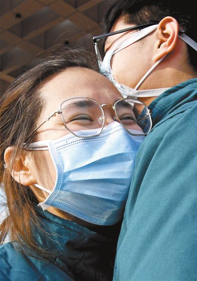 河南省直第三人民醫(yī)院的劉光耀(右)和喬冰是一對(duì)“90后”情侶,一起報(bào)名參加援鄂醫(yī)療隊(duì)。2月2日,醫(yī)療隊(duì)出發(fā)前,兩人擁抱著相互鼓勁。新華社記者 李 安攝