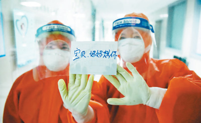 在湖北省十堰市鄖陽(yáng)區(qū)人民醫(yī)院感染科,28歲的護(hù)士焦嬌堅(jiān)守在隔離病區(qū),偶爾才能與3歲的女兒視頻通話。圖為焦嬌(左)與同事將寫有“寶貝,媽媽想你”的紙條貼在玻璃上。周家山攝(人民視覺)