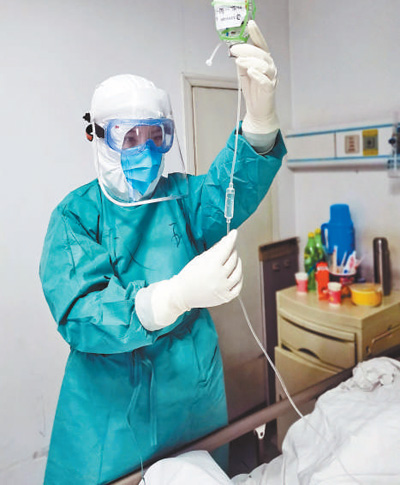中山大學(xué)孫逸仙紀(jì)念醫(yī)院呼吸內(nèi)科二區(qū)“90后”護(hù)師袁漢珍,與同事一起馳援武漢市漢口醫(yī)院,堅(jiān)守病患救治一線。圖為袁漢珍正在為病人輸液。鮮 敢 張 陽(yáng)攝影報(bào)道