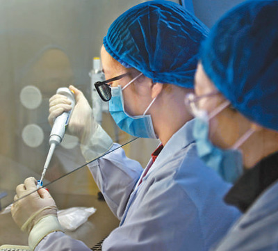 重慶市長(zhǎng)壽區(qū)疾病預(yù)防控制中心“90后”女檢測(cè)員文纖纖(左)、楊涵與病毒“零距離”對(duì)峙,持續(xù)戰(zhàn)斗在新型冠狀病毒PCR檢測(cè)室,為患者的診治爭(zhēng)取了寶貴時(shí)間。圖為兩位檢測(cè)員在提取化驗(yàn)結(jié)果。樊 強(qiáng)攝(人民視覺)