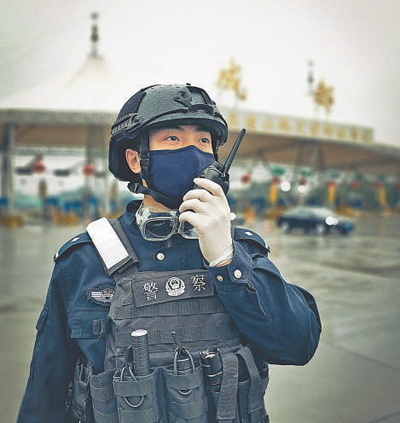 四川成都市青羊區(qū)公安分局民警楊桐今年28歲,新婚不久的他投入防疫一線,在高速公路收費(fèi)站執(zhí)勤,每天平均盤查1000余臺(tái)車輛,為2600余人測(cè)量體溫。圖為2月12日,楊桐在崗位上通過(guò)對(duì)講機(jī)與同事溝通工作。人民日?qǐng)?bào)記者 王明峰攝