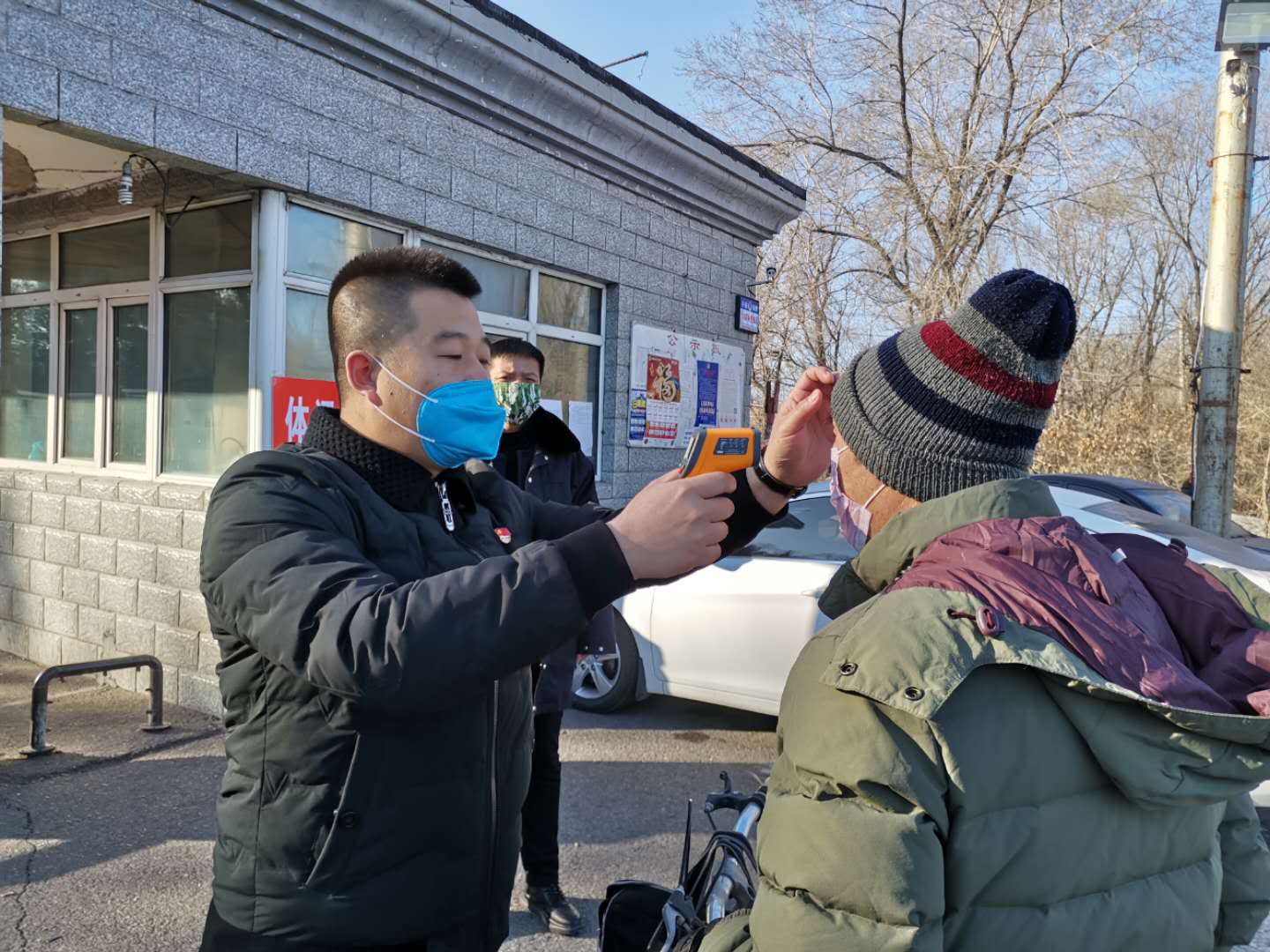 王明星主要負(fù)責(zé)辦公樓大門和礦大門的把守工作,按照礦疫情防控應(yīng)急處置領(lǐng)導(dǎo)小組關(guān)于嚴(yán)禁外來人員和車輛進(jìn)礦,對有特殊原因進(jìn)礦的本礦職工車輛實(shí)行一桿一測,對出勤的職工實(shí)行一人一測的安排部署。王明星每天清晨不倒6點(diǎn),就頭頂晨星,踏著積雪,冒著嚴(yán)寒,站在礦大門前,為出勤的職工一一測試體溫,做好登記。前段時(shí)間室外溫度最低時(shí)接近零下30度,盡管戴了手套,工作一會手指還是會被凍得麻木,為了不耽誤出勤職工時(shí)間,保護(hù)保衛(wèi)人員不被凍感冒,王明星總以自己當(dāng)過兵、身體好為由,盡可能的在崗位上多堅(jiān)持一陣,讓別的組員多在屋里呆一會,經(jīng)常在外面一站就是1個多小時(shí)。為了保證測溫儀器不在室外低溫下失靈,導(dǎo)致職工體溫測試不準(zhǔn),他在腰間掛上熱水袋,測一次體溫就把測溫儀器放在熱水袋上暖一暖,冷風(fēng)順著他敞開的領(lǐng)口往衣服里鉆,脖子一會就被凍得通紅,可是他依然不肯早進(jìn)屋暖上一暖。