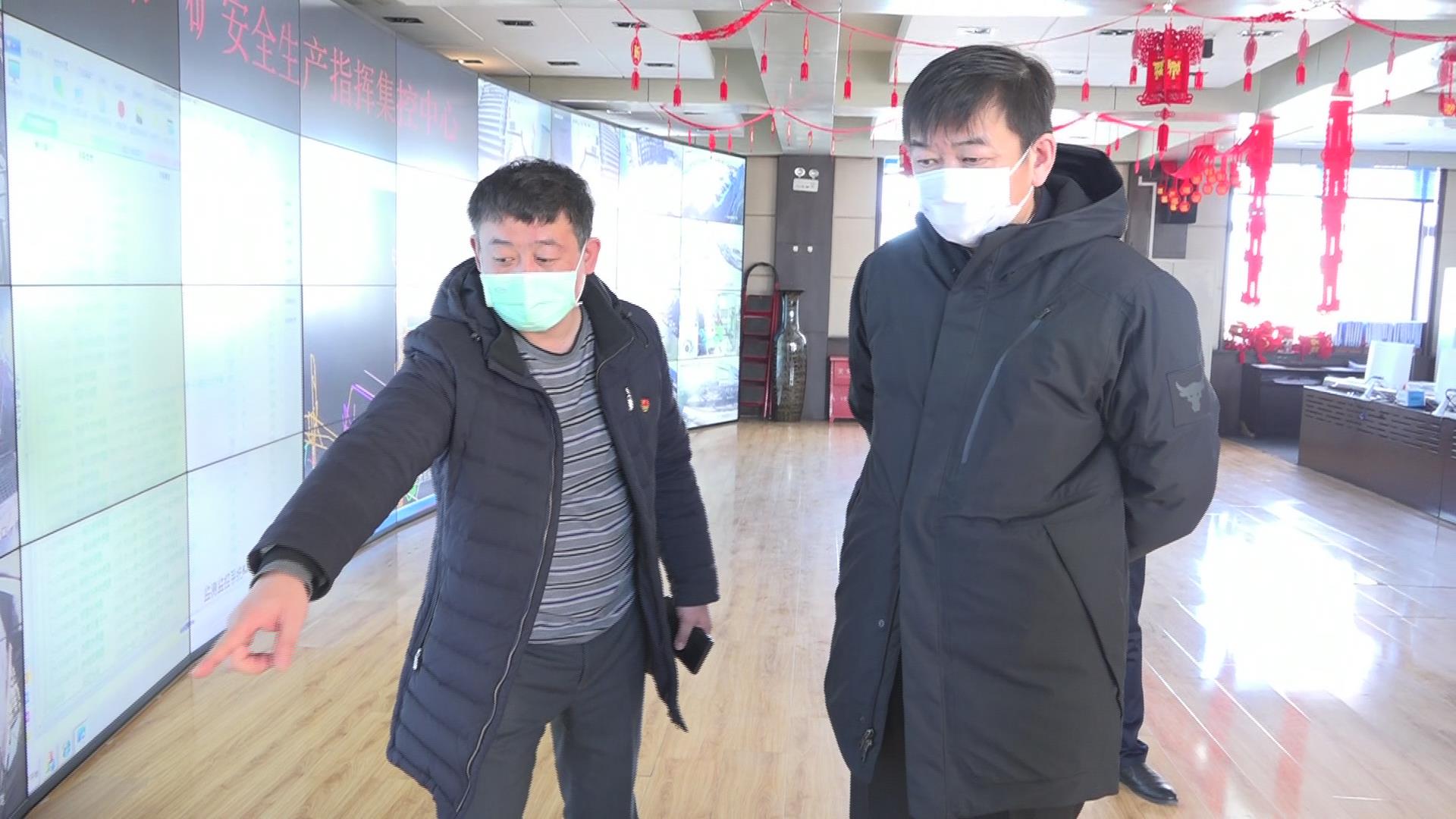 孫成坤在東榮一礦生產(chǎn)指揮集控中心查看視頻監(jiān)控、人員定位系統(tǒng)運(yùn)行情況
