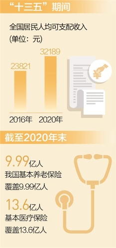“十三五”期間,我國民生保障力度不斷加大?;攫B(yǎng)老金連續(xù)多年調整,退休人員獲得感、幸福感、安全感持續(xù)增強。截至2020年末,我國基本養(yǎng)老保險覆蓋9.99億人,基本醫(yī)療保險覆蓋13.6億人,織成了一張世界最大的社會保障網。