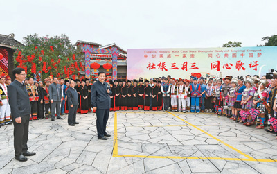 廣西是我國少數(shù)民族人口最多的自治區(qū)。27日上午,習(xí)近平來到位于南寧市邕江之畔的廣西民族博物館,參觀壯族文化展。博物館外,三月三“歌圩節(jié)”壯族對歌等民族文化活動正在這里集中展示。習(xí)近平強調(diào),廣西是全國民族團結(jié)進步示范區(qū),要繼續(xù)發(fā)揮好示范帶動作用。各民族共同團結(jié)進步、共同繁榮發(fā)展是中華民族的生命所在、力量所在、希望所在,在全面建設(shè)社會主義現(xiàn)代化國家的新征程上,一個民族都不能少,各族人民要心手相牽、團結(jié)奮進,共創(chuàng)中華民族的美好未來,共享民族復(fù)興的偉大榮光。