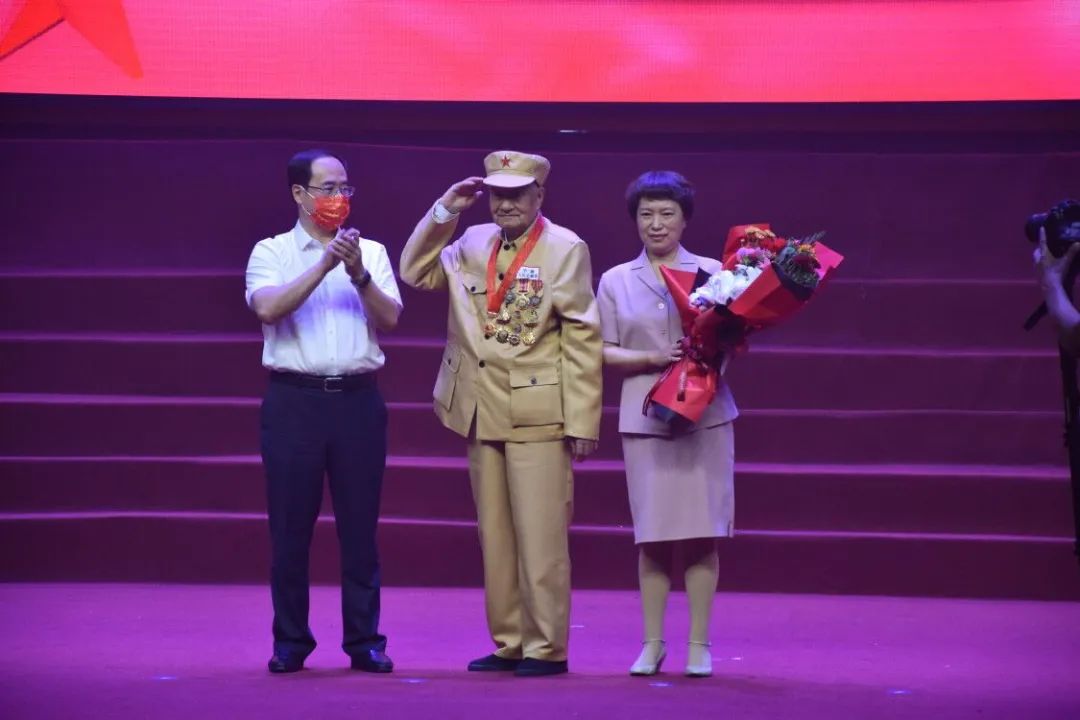 當(dāng)“在黨五十年”榮譽(yù)獲得者,劉吉慶老人代表獲獎(jiǎng)?wù)咦呱衔枧_(tái)接受大會(huì)表彰時(shí),一身戎裝、滿身勛章的老人挺拔地站在臺(tái)上向所有參會(huì)人員敬了一個(gè)標(biāo)準(zhǔn)的軍禮,與會(huì)人員掌聲經(jīng)久不息。