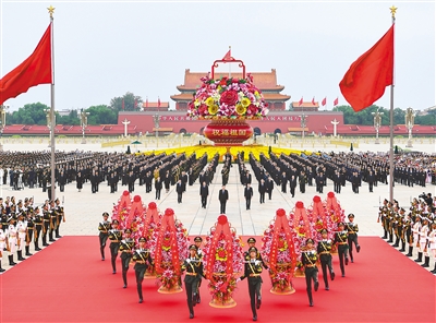 方陣前,以中共中央,全國人大常委會,國務院,全國政協(xié),中央軍委,各民主黨派、全國工商聯(lián)和無黨派愛國人士,各人民團體和各界群眾,老戰(zhàn)士、老同志和烈士親屬,中國少年先鋒隊名義敬獻的9個大型花籃一字排開,花籃紅色緞帶上書寫的“人民英雄永垂不朽”熠熠生輝。