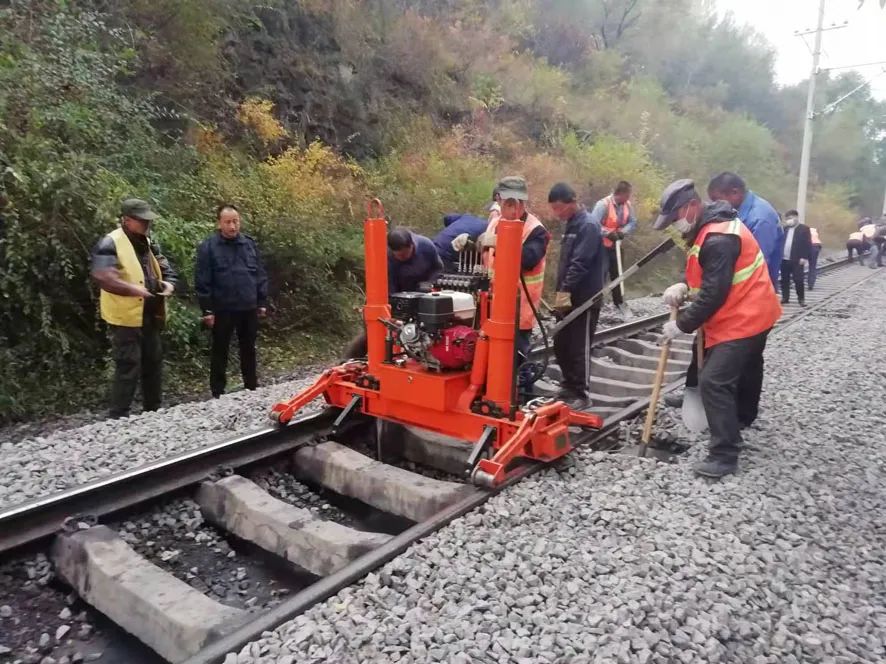 現(xiàn)場施工人員有序分工,起道、串道碴、查找環(huán)節(jié),有序銜接、密切協(xié)作、有序施工,當(dāng)起道機將軌枕抬起到起道高度后,打塞人員快速串碴固定塞位,后續(xù)施工人員兩人一組,將其它軌枕串滿道碴。天空下起了毛毛細(xì)雨,似乎是考驗著施工人員的意志,施工人員全然不顧,繼續(xù)工作著。據(jù)了解,此次整修會戰(zhàn)共補充填充道碴1200立方米,清理兩側(cè)水溝1.5公里,撤除土方1400立方米。