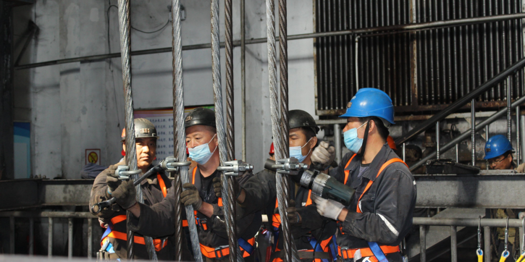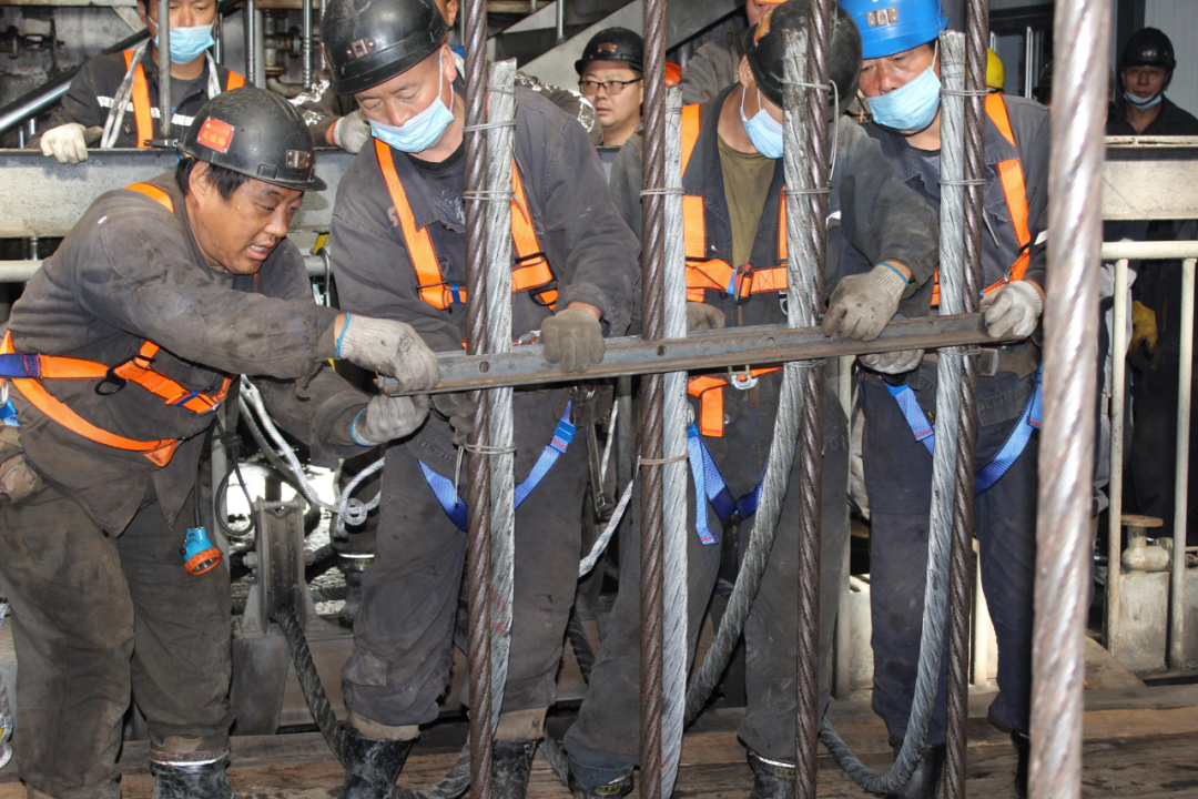 厲兵秣馬,9月28日8點班,施工人員首先將新繩引至井口,并在井口處搭跳板利用舊繩帶新繩,又將新舊繩分離開;9月29日8點班,更換首繩的戰(zhàn)斗正式打響——下井筒、上罐籠、爬井架……高空作業(yè)且空間狹小,每個環(huán)節(jié)操作都異常艱難。危險、困難、問題不時考驗著全體施工人員,而緊密配合、合力攻堅的鮮活畫面,還有頭上那跳躍的礦燈生動地詮釋出“一群人、一條心、一定贏”的誓言!