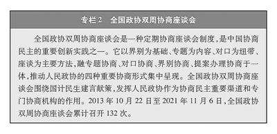 中國(guó)人民政治協(xié)商會(huì)議是實(shí)行中國(guó)共產(chǎn)黨領(lǐng)導(dǎo)的多黨合作和政治協(xié)商制度的重要機(jī)構(gòu)。人民政協(xié)作為專門協(xié)商機(jī)構(gòu),在協(xié)商中促進(jìn)廣泛團(tuán)結(jié)、推進(jìn)多黨合作、實(shí)踐人民民主,既秉承歷史傳統(tǒng),又反映時(shí)代特征,充分體現(xiàn)了中國(guó)社會(huì)主義民主有事多商量、遇事多商量、做事多商量的特點(diǎn)和優(yōu)勢(shì),是國(guó)家治理體系的重要組成部分和具有中國(guó)特色的制度安排。在人民政協(xié)制度平臺(tái)上,各黨派團(tuán)體、各族各界人士發(fā)揮在界別群眾中的代表作用,通過(guò)全體會(huì)議、常委會(huì)會(huì)議、主席會(huì)議、專門委員會(huì)會(huì)議、專題協(xié)商會(huì)議、協(xié)商座談會(huì)議等,開(kāi)展提案、委員視察考察、專題調(diào)研、反映社情民意等經(jīng)常性工作,對(duì)國(guó)家大政方針、經(jīng)濟(jì)社會(huì)各領(lǐng)域重要問(wèn)題,在決策之前和決策實(shí)施之中進(jìn)行廣泛協(xié)商、平等協(xié)商、有序協(xié)商、真誠(chéng)協(xié)商,提出意見(jiàn)建議。中國(guó)共產(chǎn)黨采納和集中他們的意見(jiàn)建議,各黨派團(tuán)體、各族各界人士接受黨的主張并在各界別群眾中宣傳解釋黨的方針政策,增信釋疑,最廣泛地反映民意,最充分地集思廣益,最大限度地凝聚共識(shí),鞏固團(tuán)結(jié)奮斗的共同思想基礎(chǔ)。全國(guó)政協(xié)全體會(huì)議與全國(guó)人大會(huì)議每年同期召開(kāi),政協(xié)委員不僅要討論政協(xié)的問(wèn)題,還要列席全國(guó)人大會(huì)議,參加對(duì)有關(guān)法律修改、“一府兩院”工作報(bào)告等的討論,這樣的制度安排真正實(shí)現(xiàn)了讓人人起來(lái)負(fù)責(zé)、人人監(jiān)督政府工作,形成了具有中國(guó)特色的“兩會(huì)”式民主。