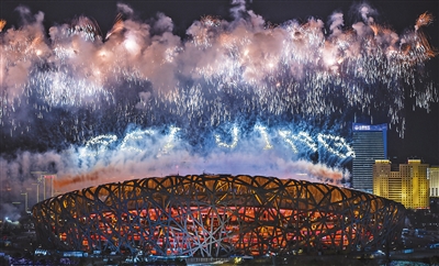 在盲童合唱團孩子們天籟般的歌聲中,“北京2022”字樣的焰火在體育場上空綻放。