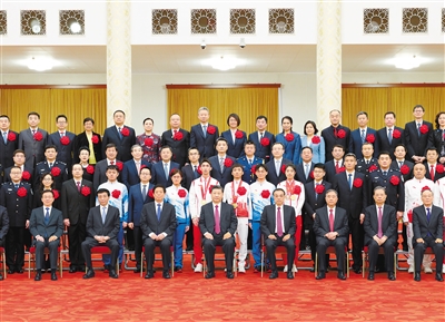 會前,習近平等領(lǐng)導(dǎo)同志親切會見了北京冬奧會、冬殘奧會突出貢獻集體代表、突出貢獻個人和中國體育代表團成員,并同大家合影留念。