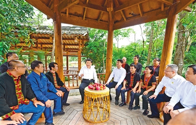 4月10日至13日,中共中央總書記、國家主席、中央軍委主席習(xí)近平在海南考察。這是11日下午,習(xí)近平在五指山市水滿鄉(xiāng)毛納村,同當(dāng)?shù)馗刹咳罕娪H切交談。新華社記者 李學(xué)仁攝