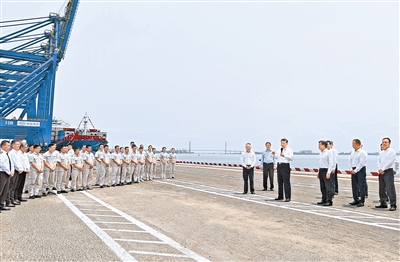 隨后,習(xí)近平來到洋浦國際集裝箱碼頭小鏟灘港區(qū),了解港口建設(shè)發(fā)展情況,同現(xiàn)場(chǎng)作業(yè)人員、掛職干部代表等親切交流。習(xí)近平強(qiáng)調(diào),振興港口、發(fā)展運(yùn)輸業(yè),要把握好定位,增強(qiáng)適配性,堅(jiān)持綠色發(fā)展、生態(tài)優(yōu)先,推動(dòng)港口發(fā)展同洋浦經(jīng)濟(jì)開發(fā)區(qū)、自由貿(mào)易港建設(shè)相得益彰、互促共進(jìn),更好服務(wù)建設(shè)西部陸海新通道、共建“一帶一路”。他指出,黨中央選派干部來自由貿(mào)易港掛職,既體現(xiàn)了黨中央對(duì)自由貿(mào)易港建設(shè)的關(guān)心和支持,也是對(duì)干部的培養(yǎng)鍛煉,要發(fā)揮掛職干部的積極作用,讓他們?cè)诨鶎右痪€增長才干。