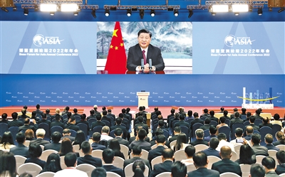 4月21日上午,博鰲亞洲論壇2022年年會(huì)開幕式在海南博鰲舉行,國(guó)家主席習(xí)近平以視頻方式發(fā)表題為《攜手迎接挑戰(zhàn),合作開創(chuàng)未來(lái)》的主旨演講。新華社記者 黃敬文攝