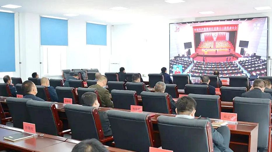 在七礦公司機關三樓調(diào)度會議室,該公司領導與機關黨員干部和職工早早來到這里等待觀看中國共產(chǎn)黨黑龍江省第十三次代表大會開幕會直播盛況。