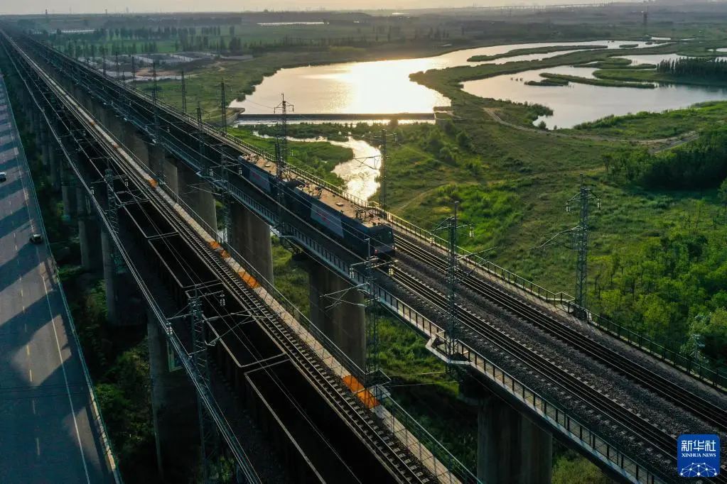 重載列車行駛在大秦鐵路上(2022年7月16日攝,無人機照片)。為做好迎峰度夏能源保供工作,中國鐵路太原局集團有限公司在確保運輸安全的前提下全力提升煤炭運量。新華社記者 曹陽 攝