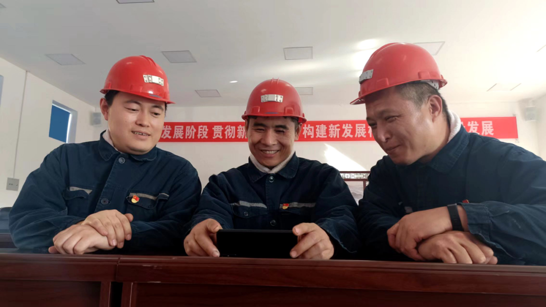 全國勞動模范、龍湖礦采煤班長楊會軍(中)與工友在班前通過手機(jī)回看黨的二十大開幕會盛況。賈曉麗 攝