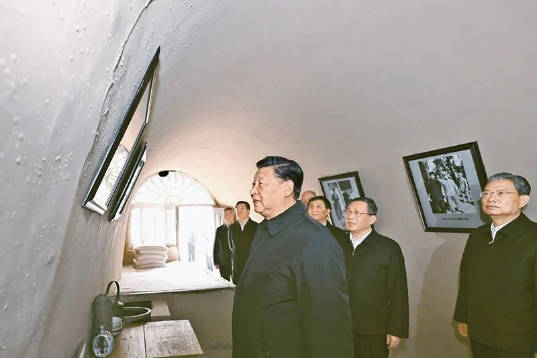 2022年10月27日,中共中央總書記、國家主席、中央軍委主席習(xí)近平帶領(lǐng)中共中央政治局常委李強(qiáng)、趙樂際、王滬寧、蔡奇、丁薛祥、李希,瞻仰延安革命紀(jì)念地。這是習(xí)近平等在楊家?guī)X參觀朱德舊居。 新華社記者 燕雁/攝
