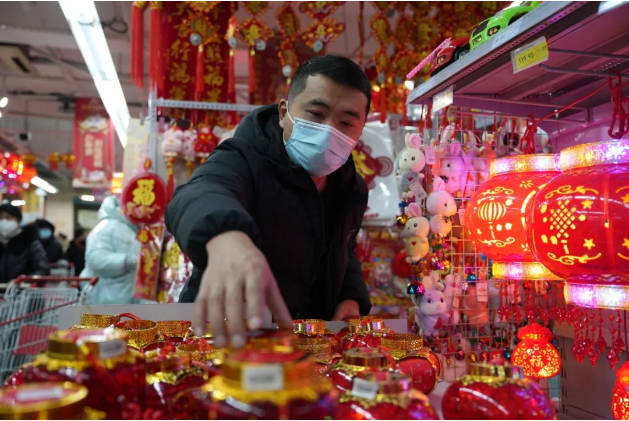 中國結、大紅燈籠、年畫、春聯(lián)……將菜市場春節(jié)氛圍值“拉滿”,詢價、議價、挑選的人們擠在各類攤位前,煙火氣升騰,年味兒濃濃。
