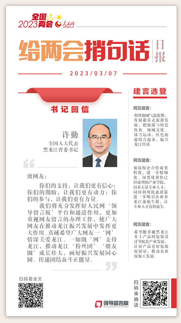 人民網(wǎng)2023年度“我給兩會捎句話”建言征集活動正在進行,廣大網(wǎng)友關(guān)注并積極參與。近日,黑龍江省委書記許勤通過人民網(wǎng)致信網(wǎng)友,回應(yīng)群眾關(guān)切。