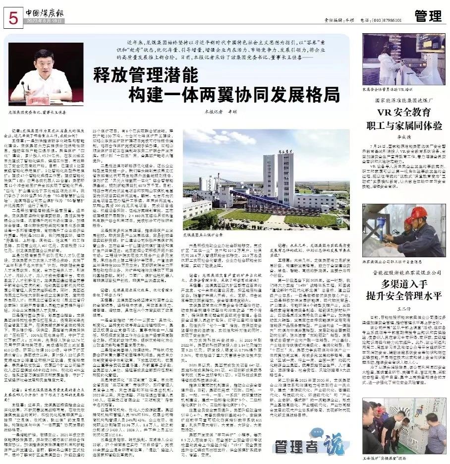 二是釋放管理潛能提升經(jīng)營質(zhì)量。近年來,龍煤集團(tuán)堅(jiān)持向管理要效益,通過實(shí)施虧損企業(yè)治理、鞏固提升內(nèi)部市場化建設(shè)、加強(qiáng)資金管理、強(qiáng)化物資招標(biāo)采購和信息化系統(tǒng)建設(shè)等一系列管理措施,有效提升了企業(yè)經(jīng)濟(jì)運(yùn)行質(zhì)量。特別是2022年,我們根據(jù)實(shí)際,理順“夯基礎(chǔ)、上標(biāo)準(zhǔn)、謀長遠(yuǎn)、促發(fā)展”的工作思路,實(shí)現(xiàn)營業(yè)收入407億元,實(shí)繳稅費(fèi)73.2億元,創(chuàng)龍煤集團(tuán)建企以來新高。