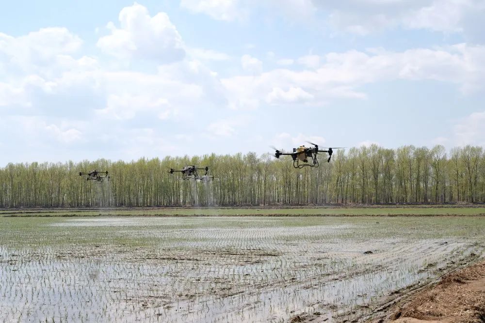 2023年5月,北大荒集團(tuán)軍川農(nóng)場有限公司正使用植保無人機(jī)對剛剛插秧的地塊噴施液態(tài)返青肥。