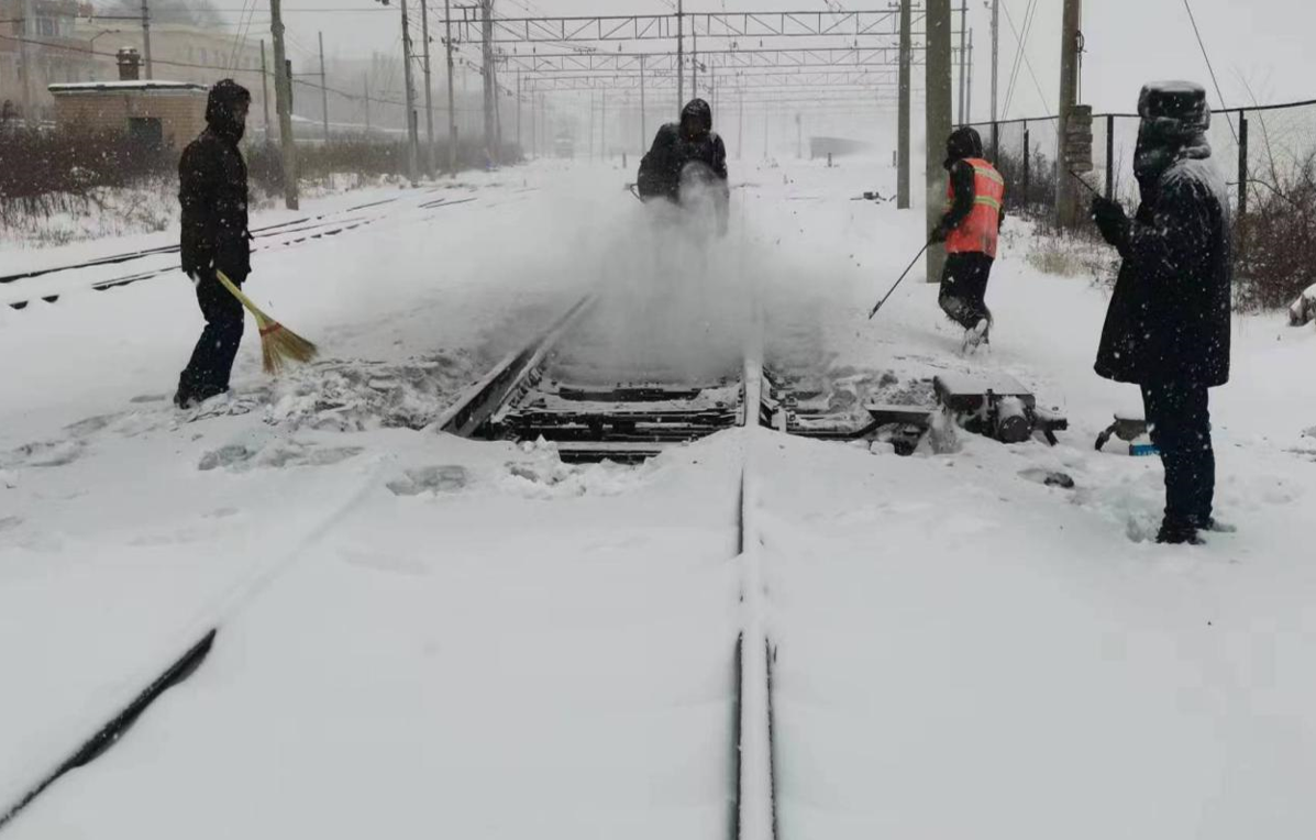 七臺河礦區(qū)鐵路工人清除道岔積雪鐵路運輸部機務段機車乘務員和車務段調(diào)車組等行車工種,嚴格執(zhí)行《礦鐵行車遇降霧、暴風、雨雪等不良天氣時安全行車辦法》規(guī)定,加強瞭望和鳴笛示警工作,預防鐵路路外事故發(fā)生。礦鐵沿線車務段、機務段、工務段等基層單位黨員干部、班組長、青年團員沖鋒在前,帶動廣大職工克服天氣寒冷、夜間能見度低等困難因素,分班次24小時堅守在運輸生產(chǎn)一線。鐵路運輸部僅6日就出動800余人次清雪,他們抬上風力除雪機,拿起鍬、鎬、笤帚、扁鏟等除雪工具,對道岔軌間的積雪進行“地毯式”清掃,做到了人不離崗、崗不留雪、邊降邊掃、邊掃邊清。目前,七臺河總長138公里的礦區(qū)鐵路暢通無阻,12座車站運營正常。