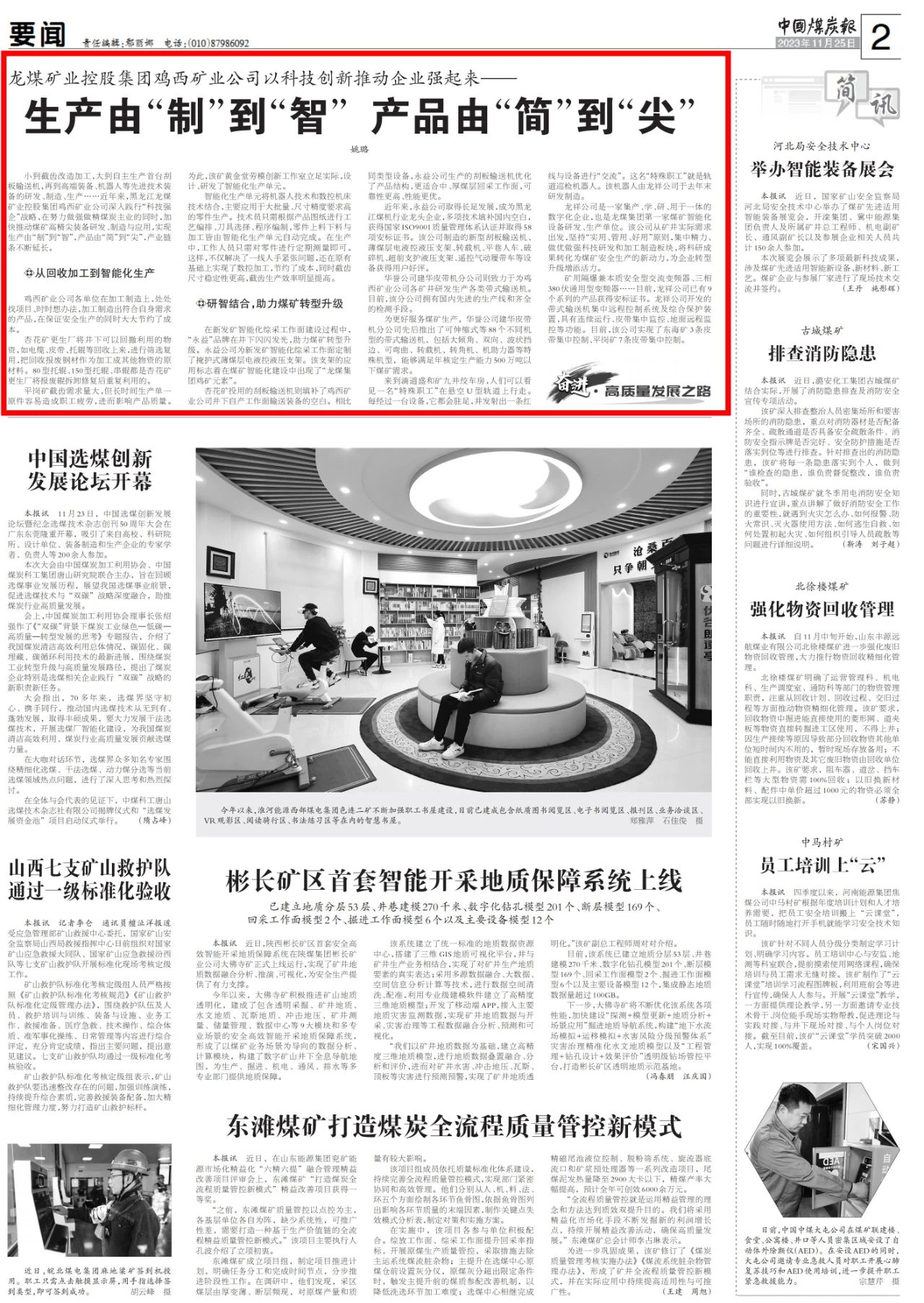 11月25日,《中國(guó)煤炭報(bào)》對(duì)雞西礦業(yè)公司推動(dòng)煤礦高精尖裝備研發(fā)制造與應(yīng)用進(jìn)行報(bào)道。