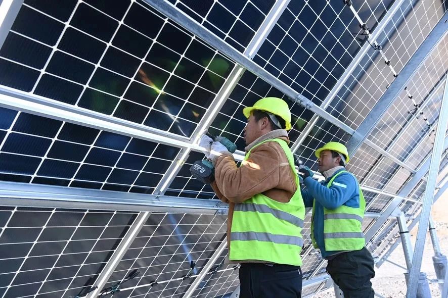 遠(yuǎn)遠(yuǎn)望去,一片深藍(lán)色的海洋映入眼簾。近看,一排排光伏板在皚皚白雪映射下,呈現(xiàn)出另一番自然生態(tài)美景。