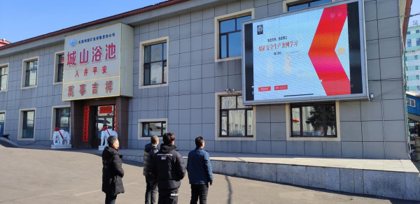 城山煤礦員工在LED屏前觀看《條例》。