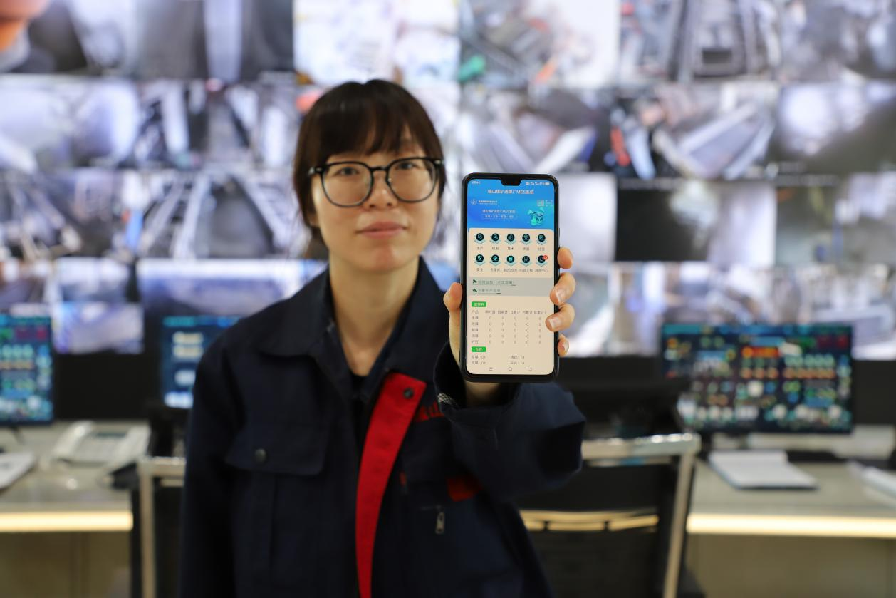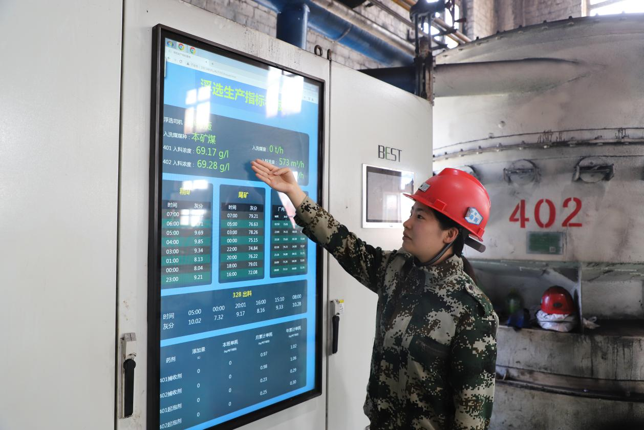 城山礦智能選煤廠現(xiàn)場人員在可操控的顯示屏上查看調(diào)整數(shù)據(jù)