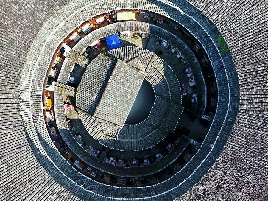 世界遺產(chǎn)委員會評價:“土樓以其建筑傳統(tǒng)和功能作為典型范例被列入,它體現(xiàn)了一種特定類型的公共生活和防御組織,并且體現(xiàn)了人類居住與自然環(huán)境和諧相處?!?/p>
