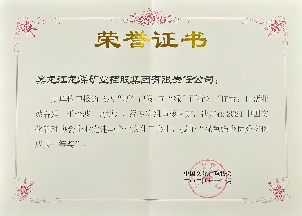 會(huì)上,由黑龍江龍煤集團(tuán)報(bào)送的《從“新”出發(fā),向“綠”而行》綠色礦山建設(shè)成果被評(píng)為綠色強(qiáng)企優(yōu)秀案例成果一等獎(jiǎng)。