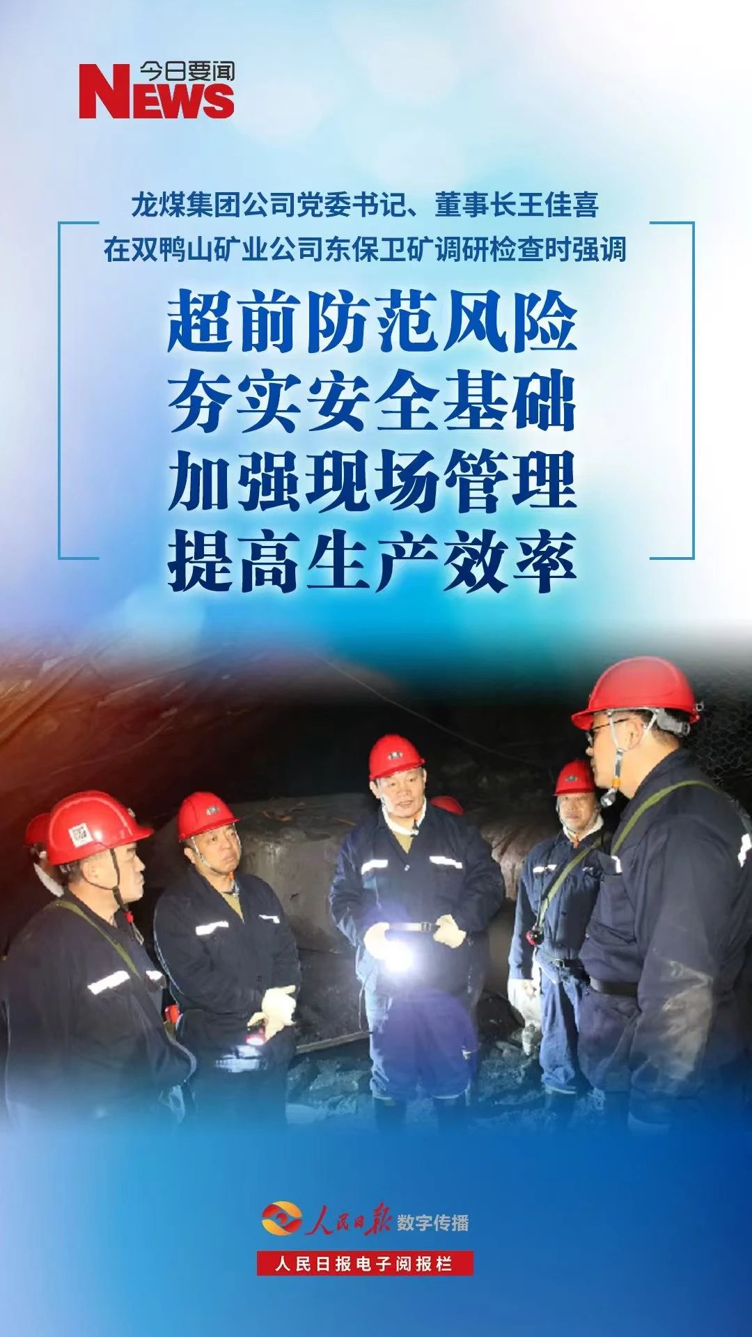11月25日,集團(tuán)公司黨委書記、董事長王佳喜在雙鴨山礦業(yè)公司東保衛(wèi)礦調(diào)研檢查時強(qiáng)調(diào),要深入學(xué)習(xí)貫徹習(xí)近平總書記關(guān)于安全生產(chǎn)重要講話重要指示精神,進(jìn)一步提高政治站位,統(tǒng)籌發(fā)展和安全,壓緊壓實(shí)各級責(zé)任,加強(qiáng)現(xiàn)場管理,細(xì)化安全措施,超前防范安全風(fēng)險,推動企業(yè)安全高效發(fā)展。